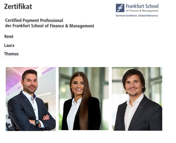 Bereits im letzten Jahr hat unsere ZV-Expertin Laura den zweiwöchigen Studiengang zum Certified Payment Professional an der Frankfurt School of Finance erfolgreich abgeschlossen und mit der Abschlussprüfung das zugehörige Zertifikat erworben. In diesem Jahr folgten ihr unsere beiden weiteren ZV-Experten René und Thomas und schloßen den Studiengang ebenfalls mit Zertifikat erfolgreich ab. In dem lehrreichen Studiengang erweiterten unsere ZV-Experten ihr theoretischens Wissen in den Bereichen Zahlungsverkehr in Deutschland und Europa, Zahlungsverkehr international sowie im dokumentären Zahlungsverkehr. Ebenfalls wurden neue Trendthemen behandelt und das Wissen im Bereich Cards, mobile Payments sowie Cash Mangament und E-Banking vertieft. Wir gratulieren den drei Kollegen und danken ihnen für die Zeit, die sie neben dem Studiengang in die Vorbereitung der Abschlussprüfung investiert haben.